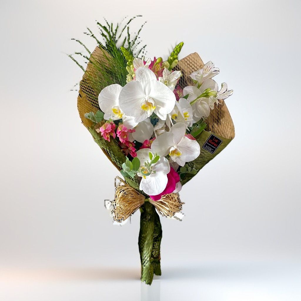 Buquê composto por Orquidea Phalaenopsis, bocas-de-leão, Alstroemérias e vassourinha.